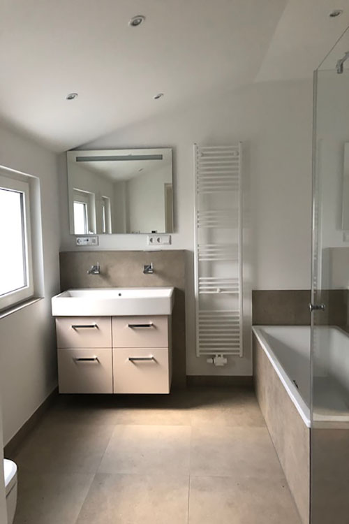 Im Verlauf der Badsanierung übernehmen wir sämtliche Arbeiten, von der Sanitärinstallation über die Fliesenverlegung bis zur Montage der Badezimmermöbel. Dabei achten wir auf die Einhaltung der Planung sowie der gesetzlichen Standards. Während des gesamten Prozesses stehen wir Ihnen als zentraler Ansprechpartner zur Verfügung, um Transparenz und Qualität zu gewährleisten. Regelmäßige Bestandsaufnahmen lassen Raum für Anpassungen und weitere Absprachen.